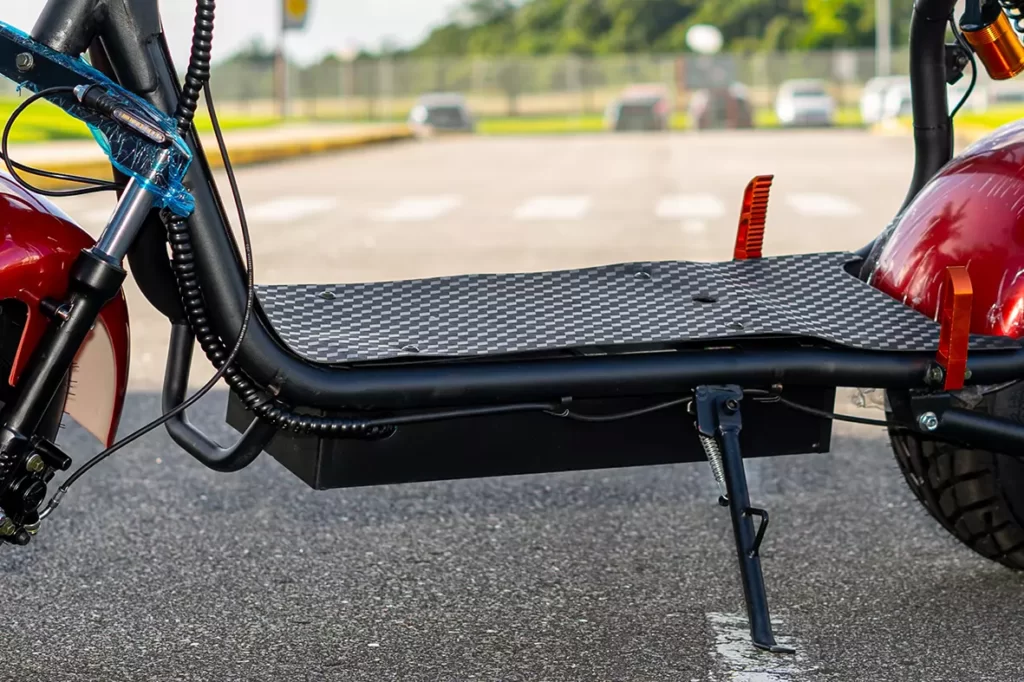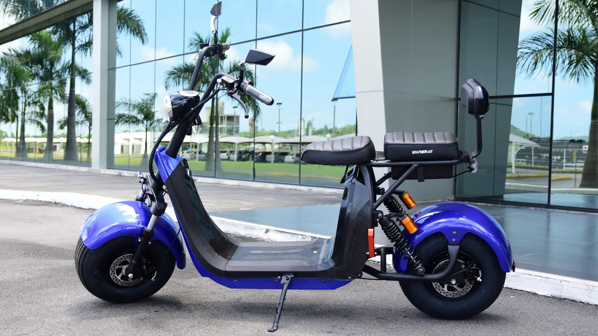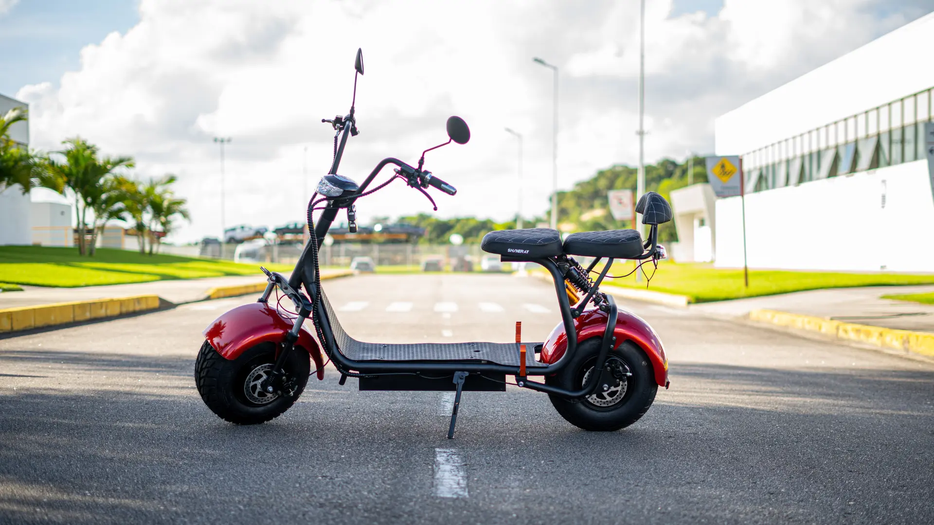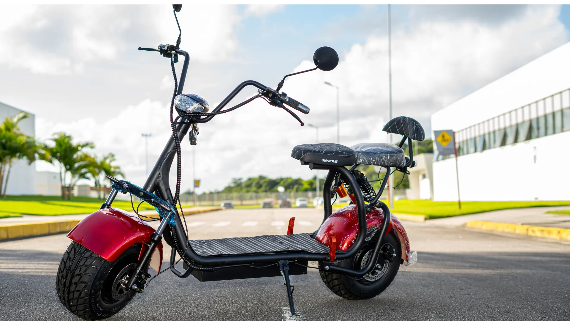 A bateria é de 60v 20Ah, com autonomia estimada por bateria de até 50km, e tempo de carga de 6-8 horas em média.