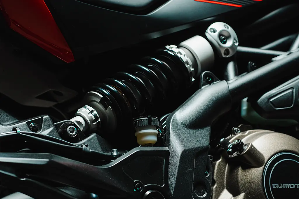 Para elevar sua experiência de pilotagem e garantir trajetos mais seguros e confortáveis, a SBM 400s conta com garfo telescópico invertido na dianteira e suspensão traseira monoshock.