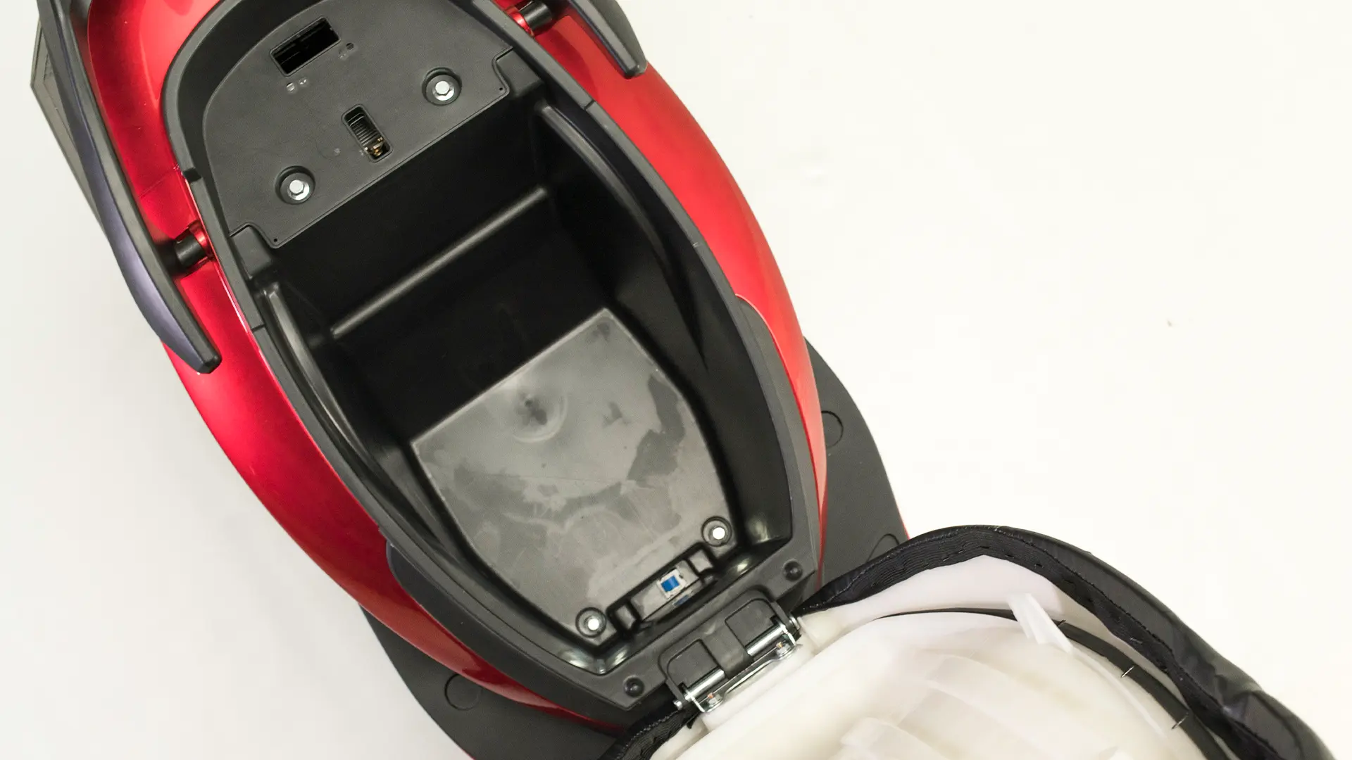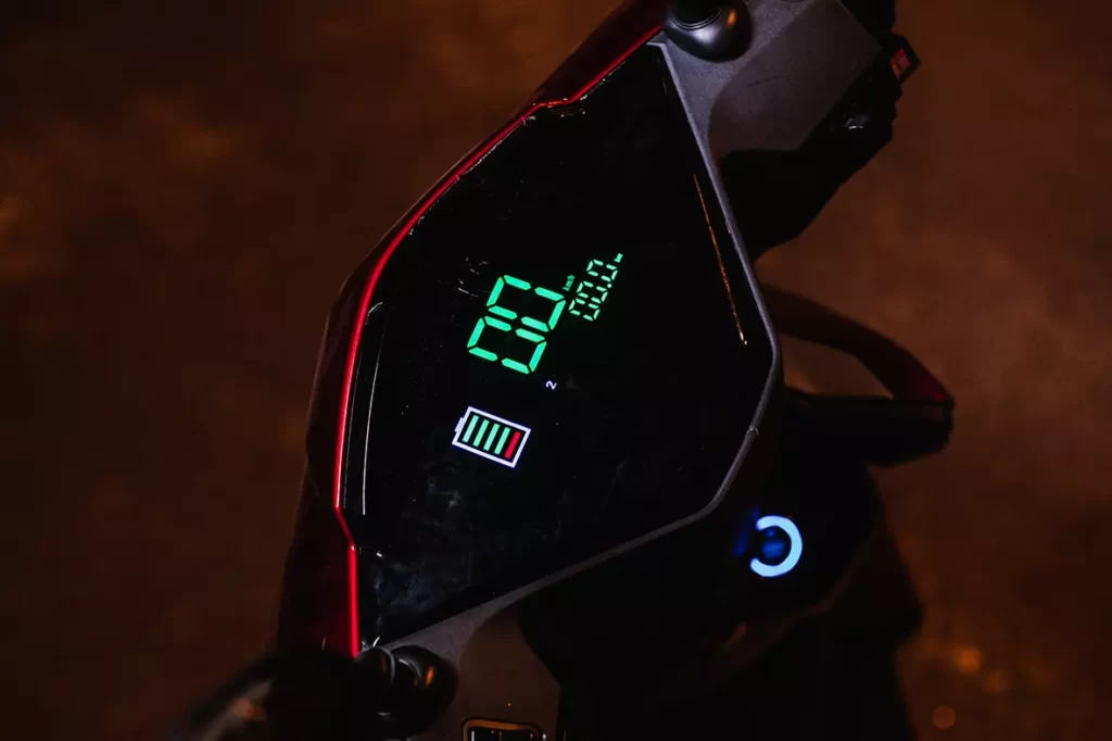A bateria é de chumbo/ácido não removível de 72v 32Ah, com autonomia estimada por bateria de até 80km, e tempo de carga de 8-10 horas em média.