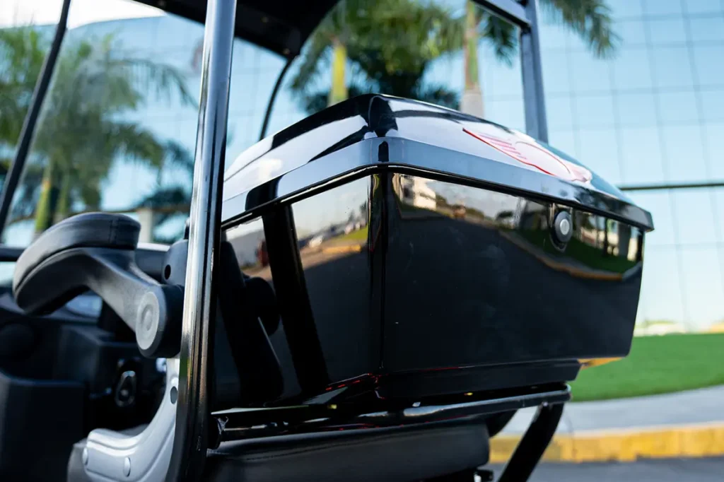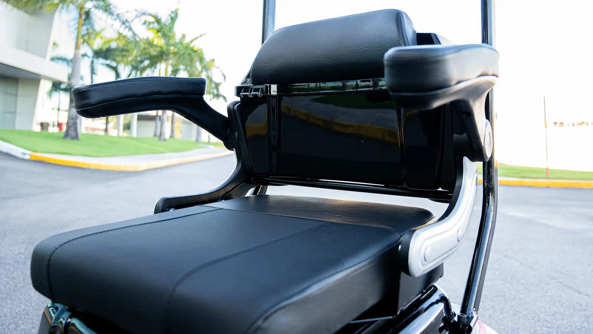 O SH4 possui encosto de costa e braços, além do porta objeto traseiro.